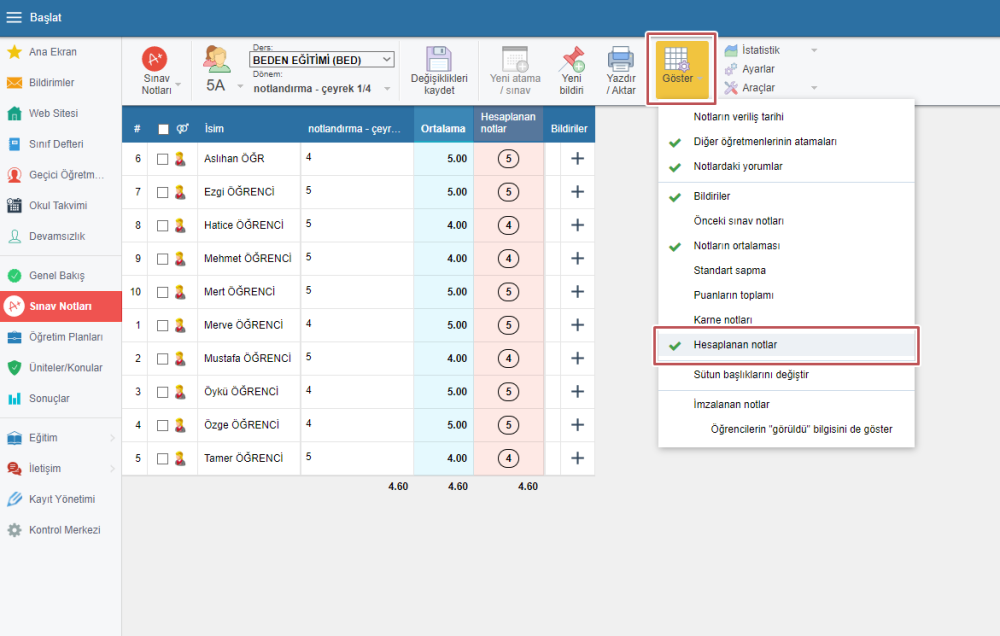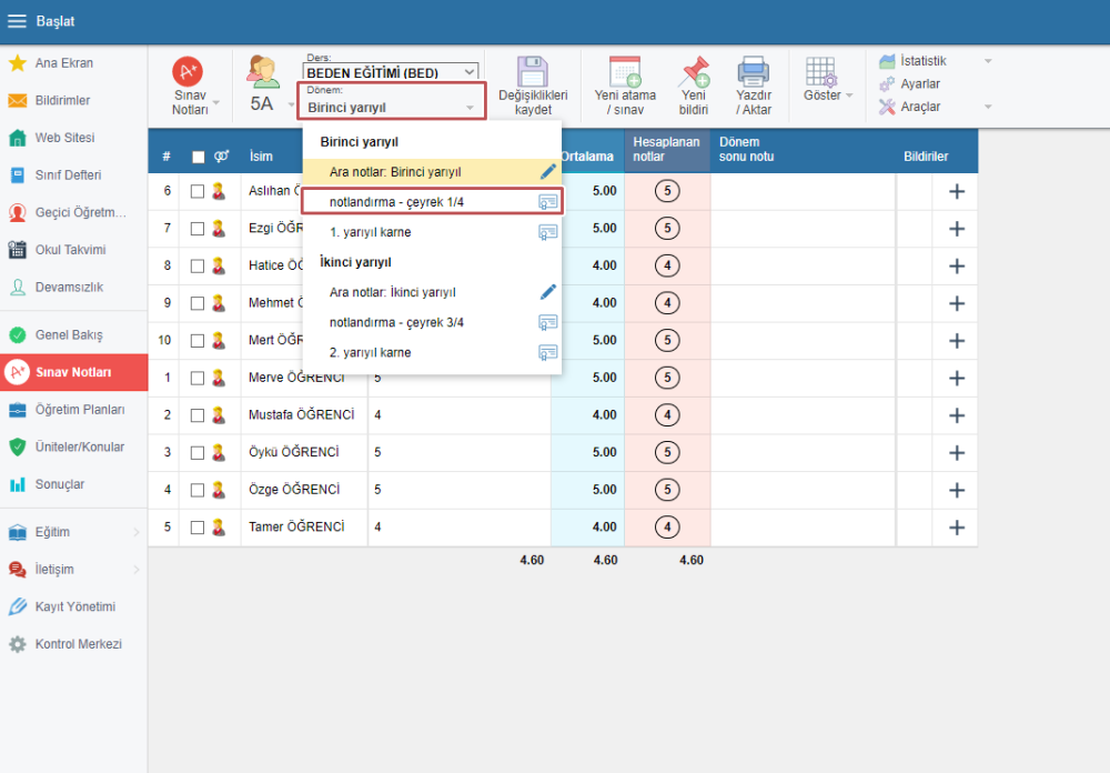 Yarı dönem periyodunu seçin ve “Araçlar” butonuna tıklayıp “Karne notlarını hesapla” seçeneğini işaretleyin. Hesaplanan notlar gösterilir, değişiklikleri kaydedin.