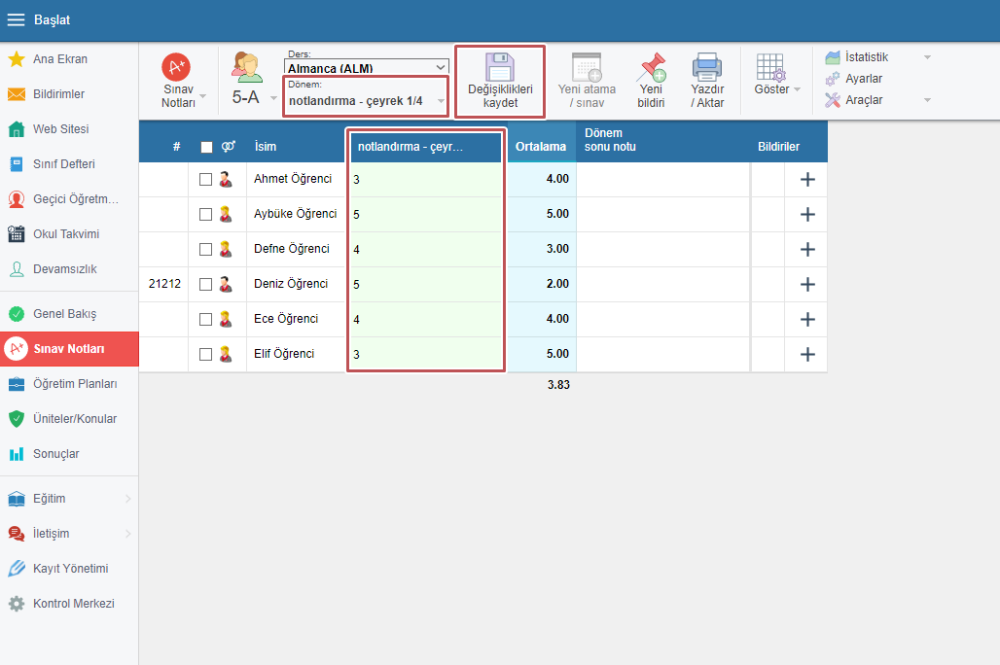 Yeni bir sütun karşınıza gelir. Yarı dönem notlarını bu sütuna girin. Değişiklikleri kaydedin.