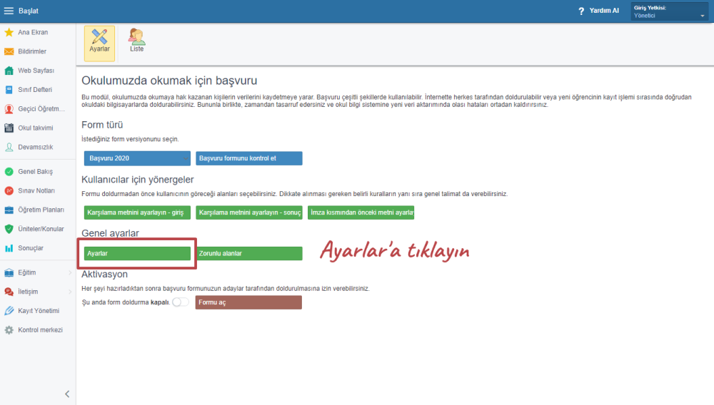 Elektronik başvuru ayarlarına erişmek için, Başlat > Özel sayfalar > Başvuru > Yönetim’e gidin.