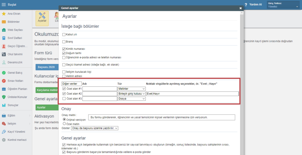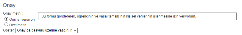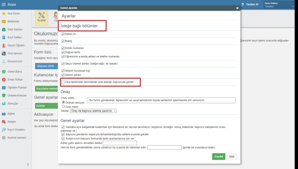 Eğer okul tanımlanmış bilgiler harici ekstra bilgi almak istiyorsa, “Okul tarafından tanımlanan özel alanları başvuruda göster” kutucuğunu işaretleyin.