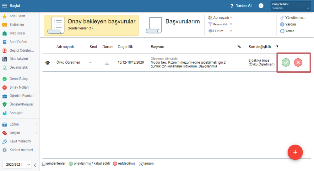 Yetkili kişi kimlerin başvuruları onaylayabileceğini ayarlayabilir. İlgili kişiye bekleyen başvurular hakkında bildirim gider. İlgili veliye başvuruları kabul edildikten sonra anında bildirim gider. Başvurunun onayından sonra sistem otomatik olarak bu tarihler için devamsızlık notları oluşturur. Velinin ekstra devamsızlık notu girmesine gerek kalmaz.