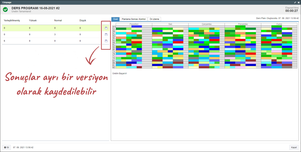 Oluşturulan her ders programı için uygulanmayan kısıtlamaları ve ders programınızın ön izlemesini görebilirsiniz.
