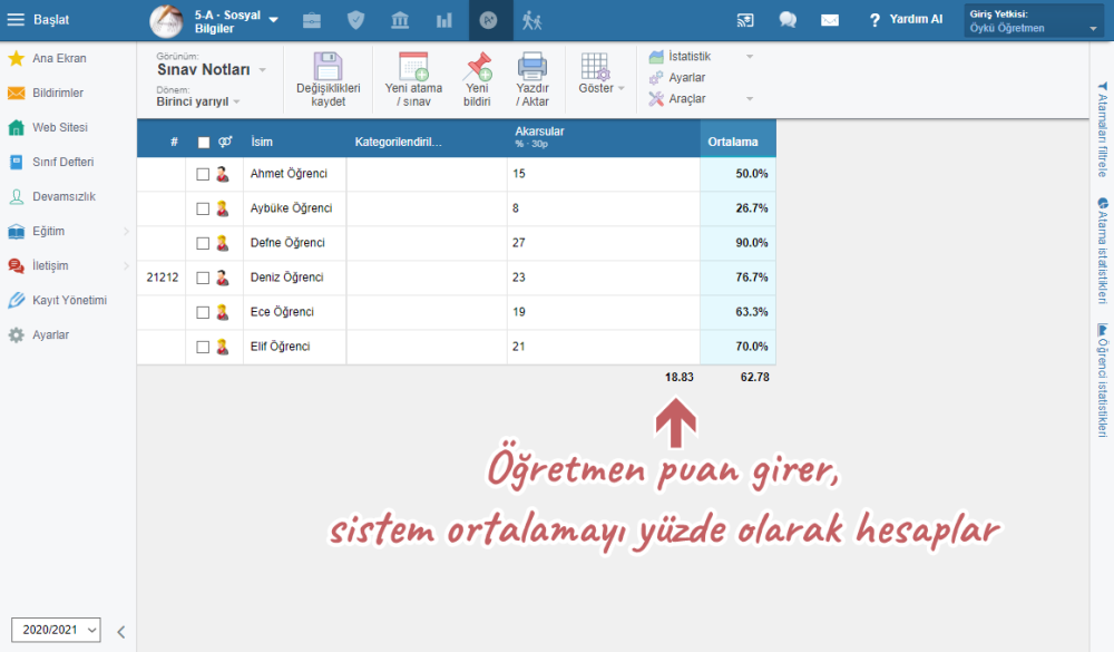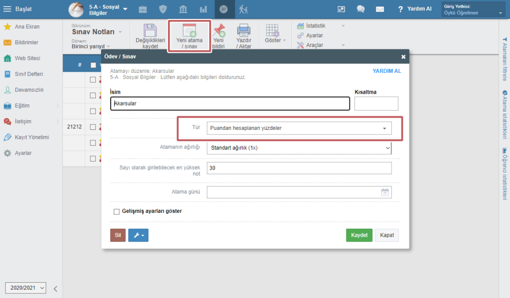 Bu tip değerlendirme türlerinde öğretmen, öğrencinin alabileceği maksimum puanı girer. Öğretmen öğrencinin aldığı puanı girdiğinde, sistem bu puanı yüzdeye çevirir.