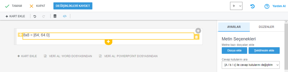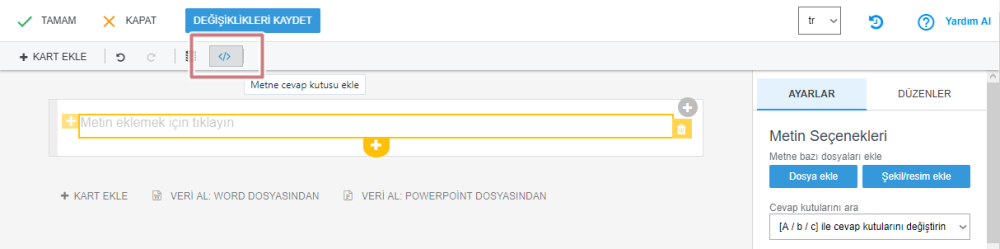 Doldur/seç soru kartının ek seçenekleri