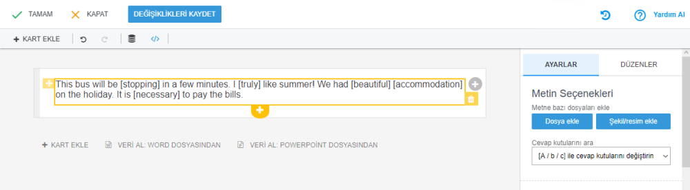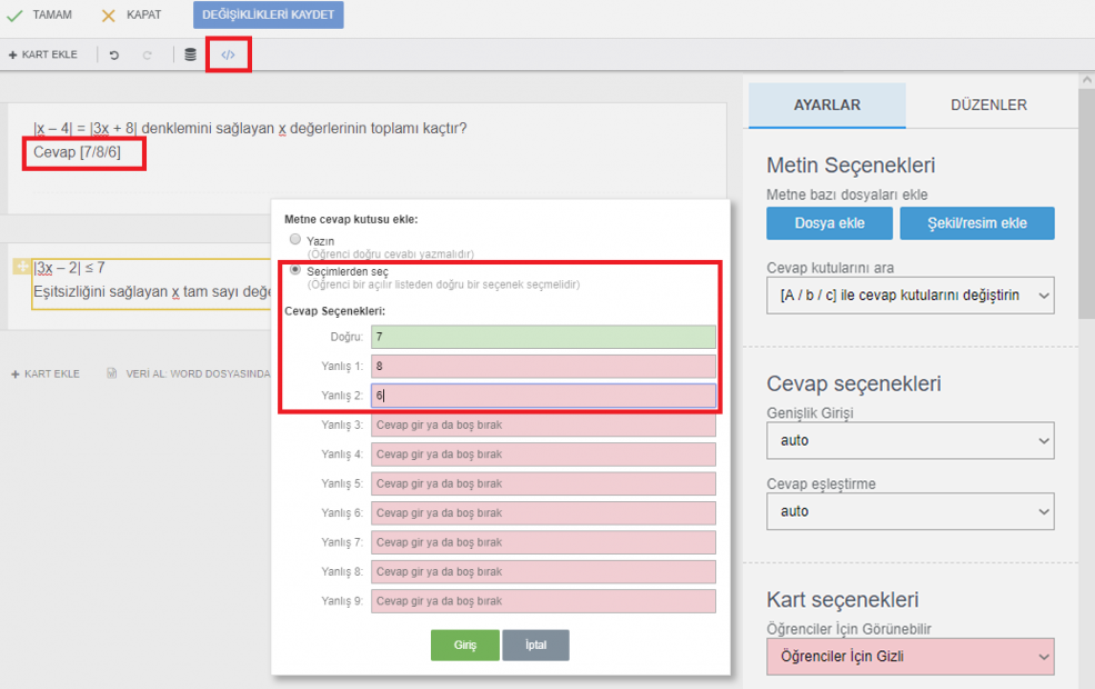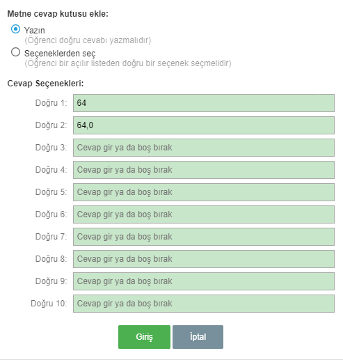 Öğretmen cevapları köşeli parantez içine yazar. Cevaplar “/” ile ayrılır. Her zaman önce doğru cevabı girin.