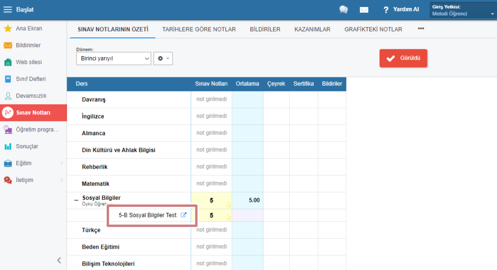 Öğrenciye notu bildirilir. Not defterindeki etkinliğe tıklayıp,