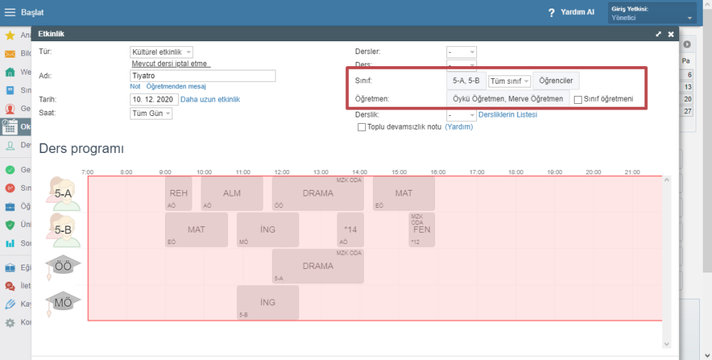 Sistem “Yeni Ekle” penceresini bütün öğretmenler ve sınıflar seçili olarak açar.