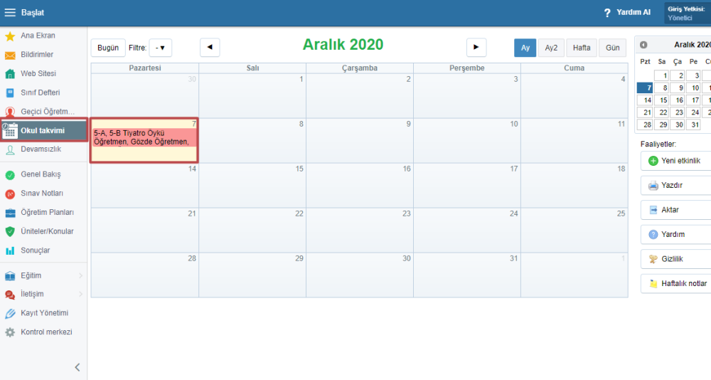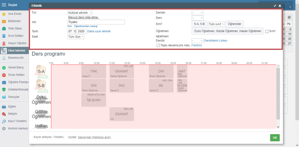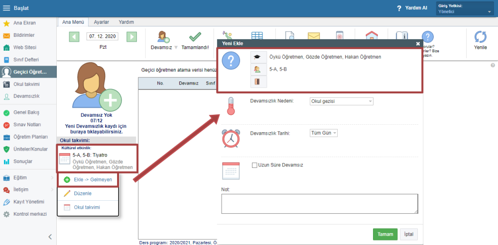 Okul takvimine yeni etkinlik eklediğinizde, otomatik olarak günlük geçici öğretmen atama sekmesine gider.