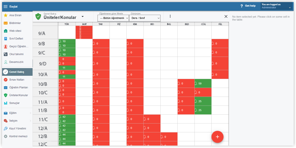 Üniteler/Konular sekmesinde yönetici, öğretmenlerin üniteleri kullanıp kullanmadığını görebilir.