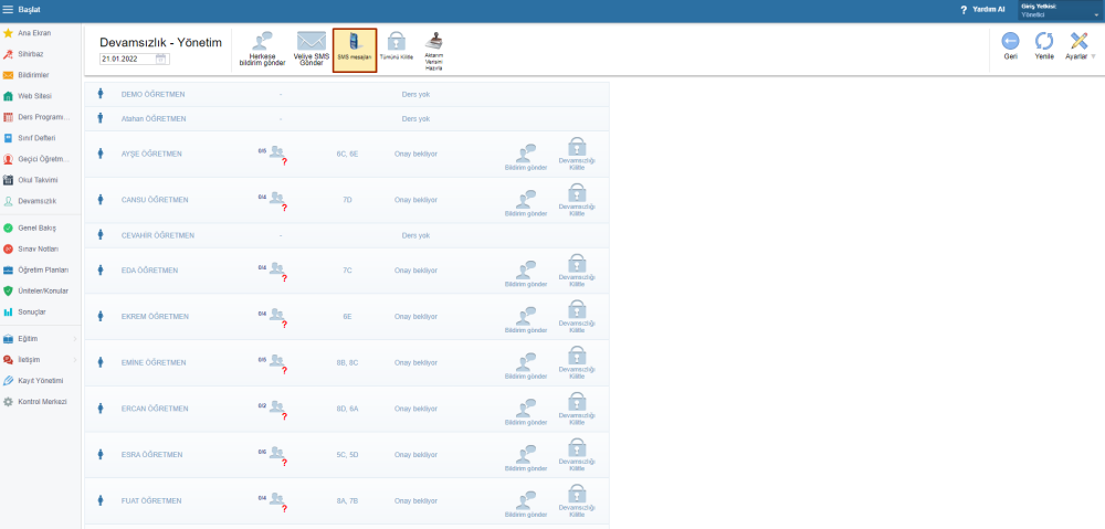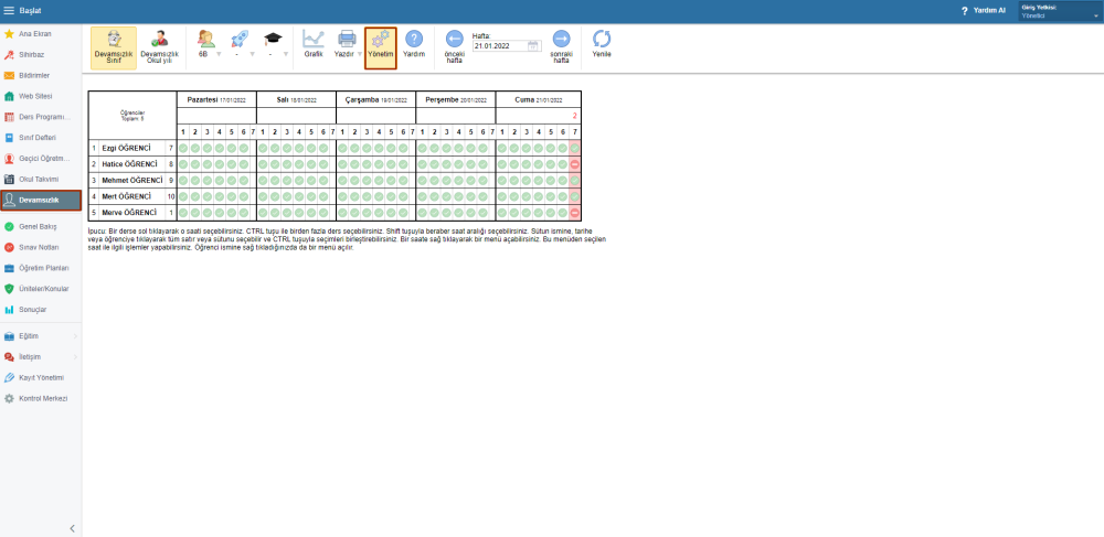Devamsızlık sayfasında Yönetim modülünü seçin.