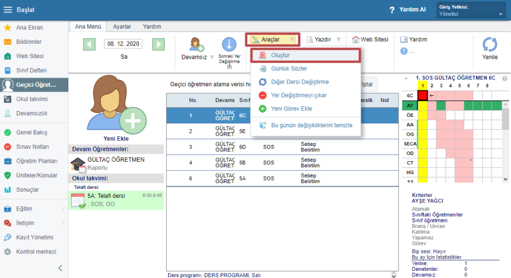 Araçlar – Oluştur sekmesini kullanarak seçili gün için tek seferde tüm geçici öğretmenleri atayabilirsiniz.