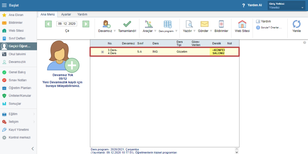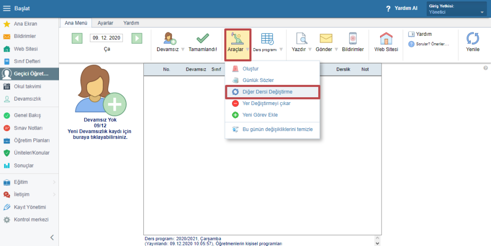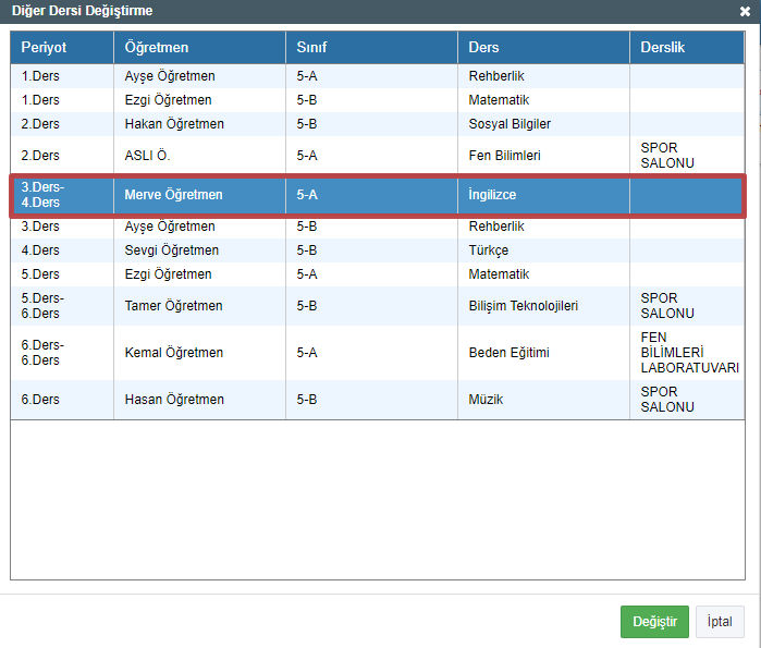 Herkesin mevcut olduğu durumlarda belirli bir dersi düzenlemeniz gerekirse (dersliği değiştirmek vb.) Ana menüden “Araçlar – Diğer Dersi Değiştirme” seçeneğine tıklayın.