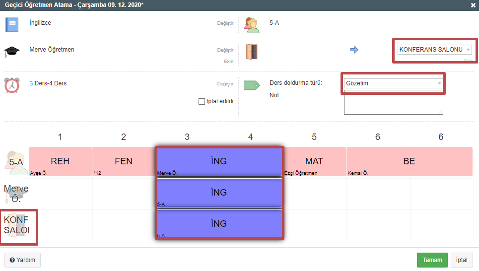 Dersliği, öğretmeni, dersi ve ders saatini istediğiniz seçenekle değiştirebilirsiniz.