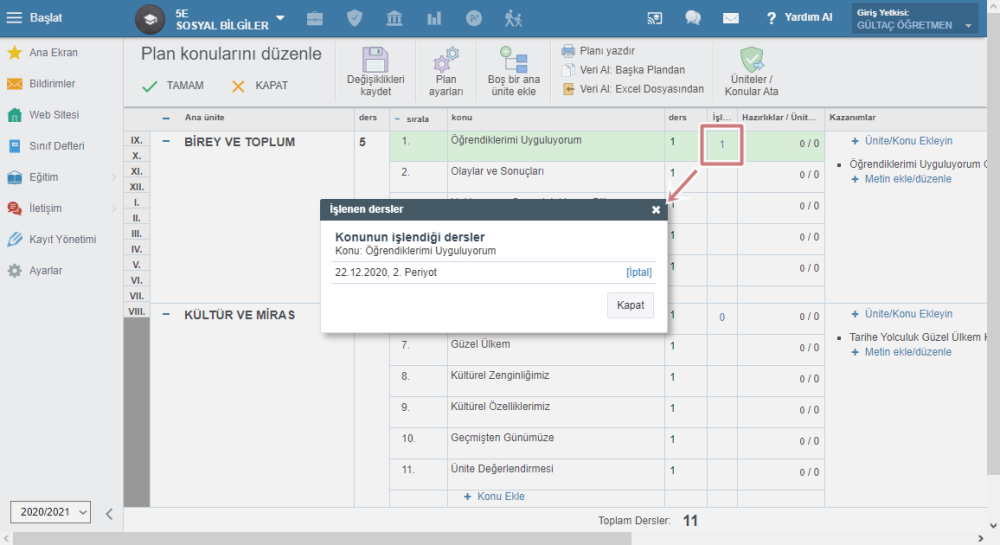 İşlenen dersler sayısına tıklayın. Bu konuların işlendiği tarihleri gösteren bir pencere açılır: