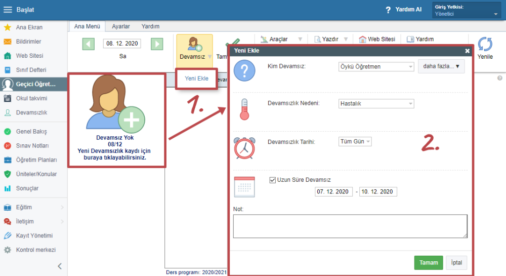 2. “Yeni Ekle” penceresi açılır. Buradan olmayanları (öğretmenler, sınıflar, derslikler) seçebilir ve bütün gün veya belirli bir süre için yok olarak işaretleyebilirsiniz. Ayrıca uzun süreli devamsızlık belirleyebilirsiniz.