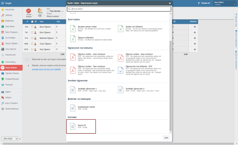 Not girişleri tamamlandıktan ve karne ayarları yapıldıktan sonra karneleri yazdırabilirsiniz.