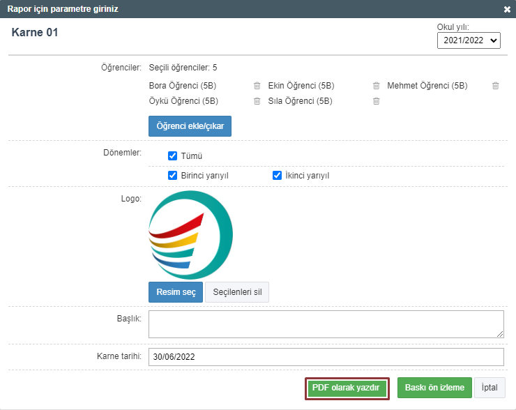 Ön izlemede bir sorun yoksa, PDF olarak yazdır seçeneğine tıklayarak karnelerinizi yazdırabilirsiniz.