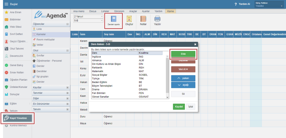 “Kayıt Yönetimi” modülüne tıklayın. Buradan “Karneler” sekmesine gelin ve “Dersleri Ayarla” seçeneğine tıklayın. Ekle seçeneğine tıklayarak dersleri ekleyebilirsiniz.