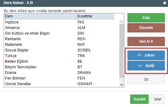 Ders listesinde istediğiniz dersleri aşağı ve yukarı taşıyabilirsiniz.