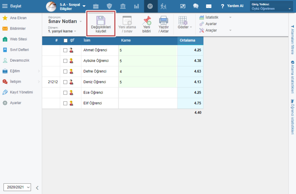Karşınıza karne notu sütunu çıkar. Buradan 1. yarıyıl notlarını girebilirsiniz. Lütfen 1. yarıyıl ve 2. yarıyıl not sütunlarını karıştırmayın.