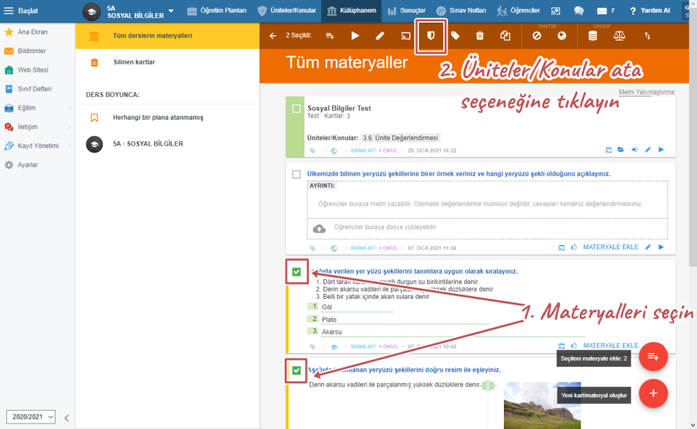 Üniteye atamak istediğiniz materyalleri seçin. Üst menüden “Üniteler/Konular Ata” seçeneğine tıklayın.