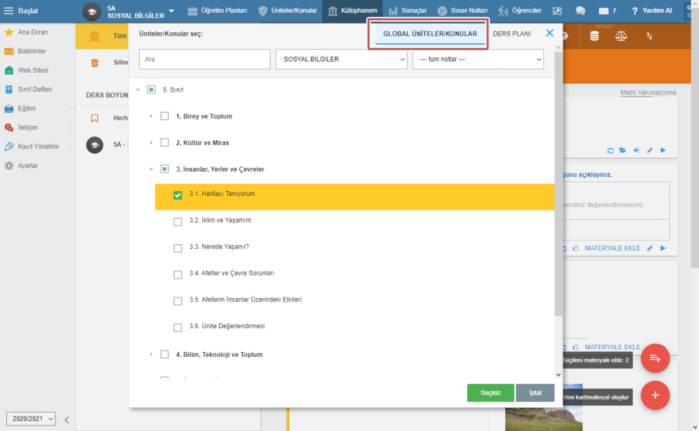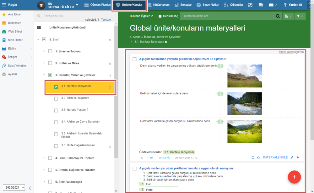 Materyali eklemek istediğiniz üniteyi/konuyu seçin.