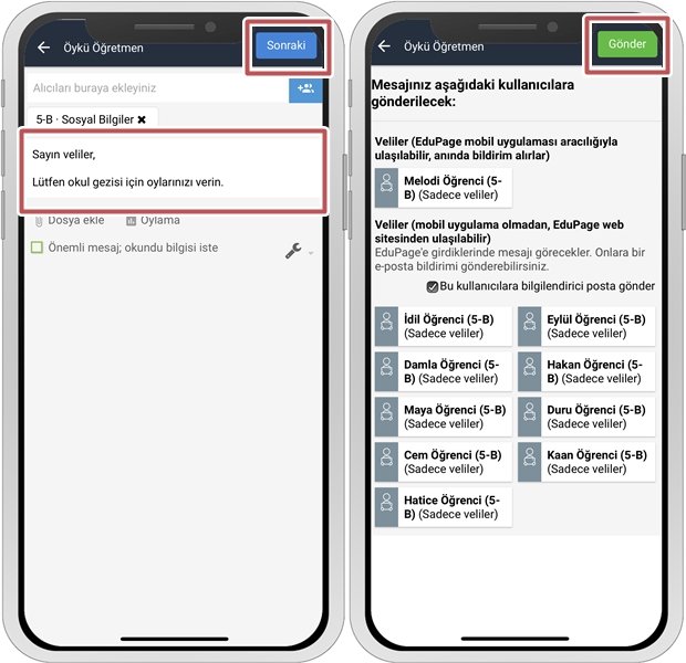 Mesajı yazın ve “Devam butonuna tıklayın. Sistem, mesajın kimlere gönderileceğini gösterir.