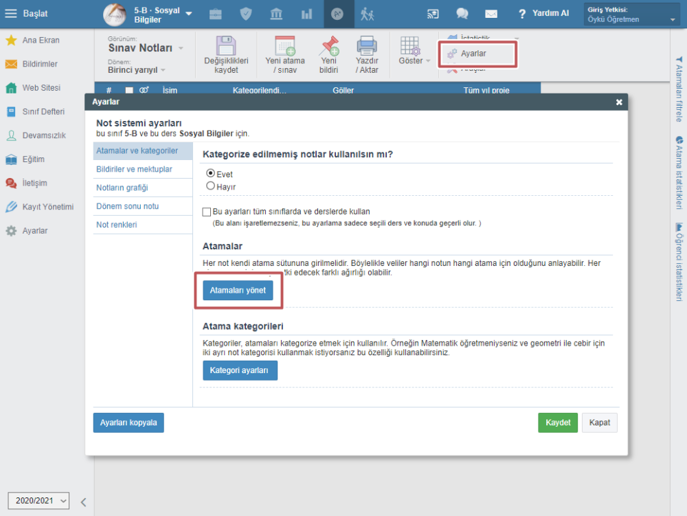 Var olan atamalarınızın ayarlarını “Ayarlar” sekmesine tıklayıp “Atamayı yönet” butonuna tıklayarak değiştirebilirsiniz.