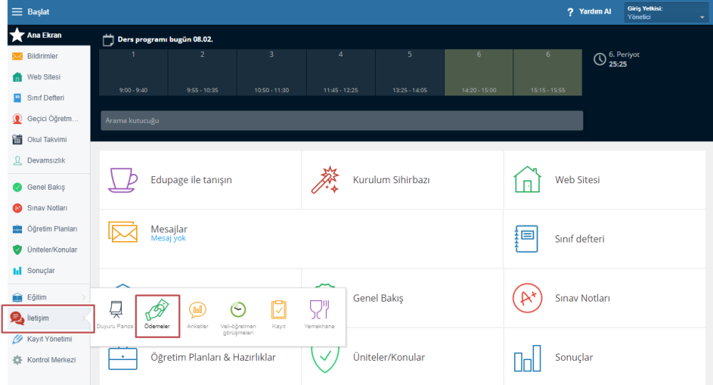 Ödemeler modülünü sol menüdeki “İletişim” sekmesinde bulabilirsiniz. Ödemeler modülünü görüntüleyebilmek için ya yönetici ya da erişim izni verilmiş öğretmen hesabınızın olması gerekir.