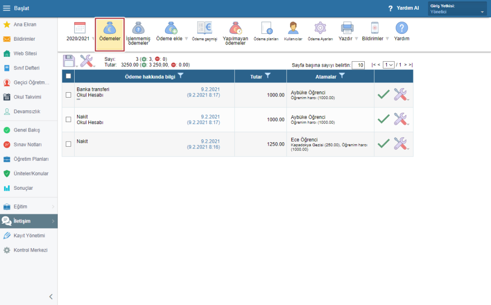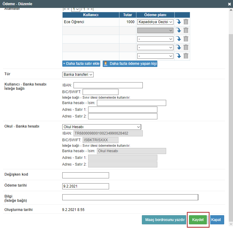Açılan pencerede istediğiniz değişiklikleri yapabilirsiniz. Ödemeler farklı ödeme planına tekrar atanabilir. Değişiklikleri kaydedin.