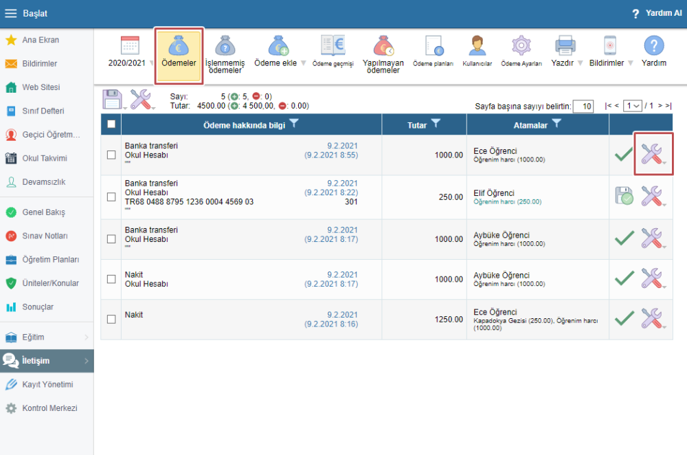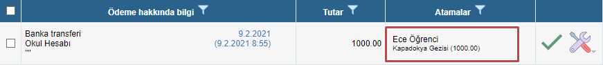 İlgili satırı seçin ve ödemenin atamasını değiştirmek için “Ayarlar” simgesine tıklayın ve “Düzenle” seçeneğine tıklayın.