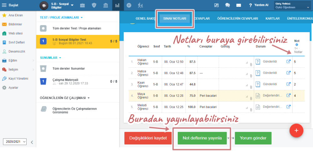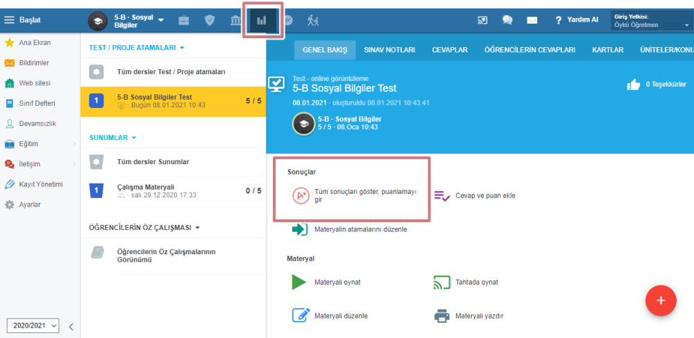 Üst menüden Sonuçlar sekmesine tıklayın. Atama listesinden değerlendirmek istediğiniz testi, ödevi veya projeyi seçin.