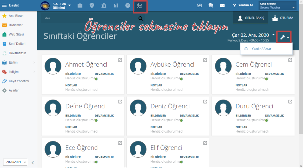 Öğrenciler sekmesine gelin ve Ayarlar simgesine tıklayın.
