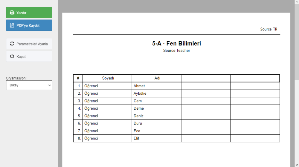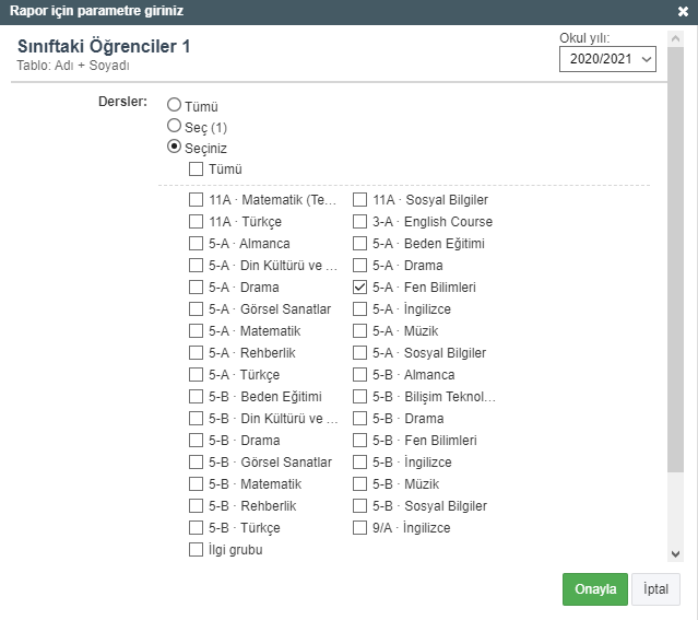 Eğer farklı derslerin öğrencilerinin listesini yazdırmak istiyorsanız istediğiniz dersleri seçin. Her ders için ayrı bir sayfa oluşturulur.