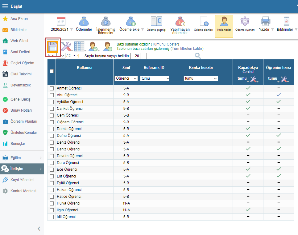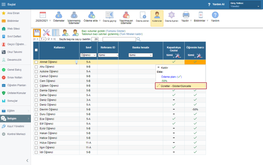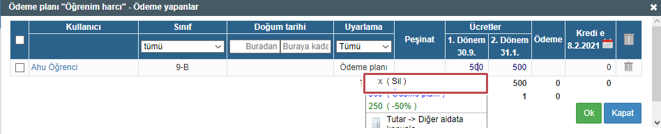 Aşağıdaki örnek resimde bir öğrencinin ödeyeceği ücret nasıl silinir/değiştirilir görebilirsiniz. Öğrenci ilk dönem hiçbir ücret ödemeyecek, ikinci dönem de %50 indirimle ödeme yapacak.