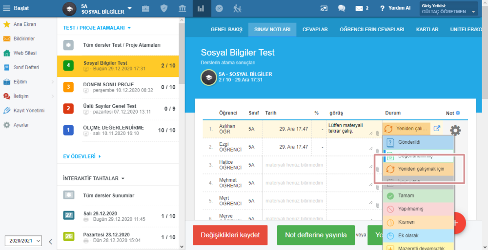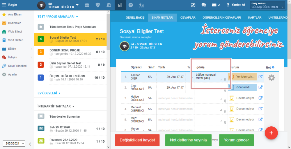 İsterseniz öğrencinize yorum da bırakabilirsiniz. Değişiklikleri kaydedin.