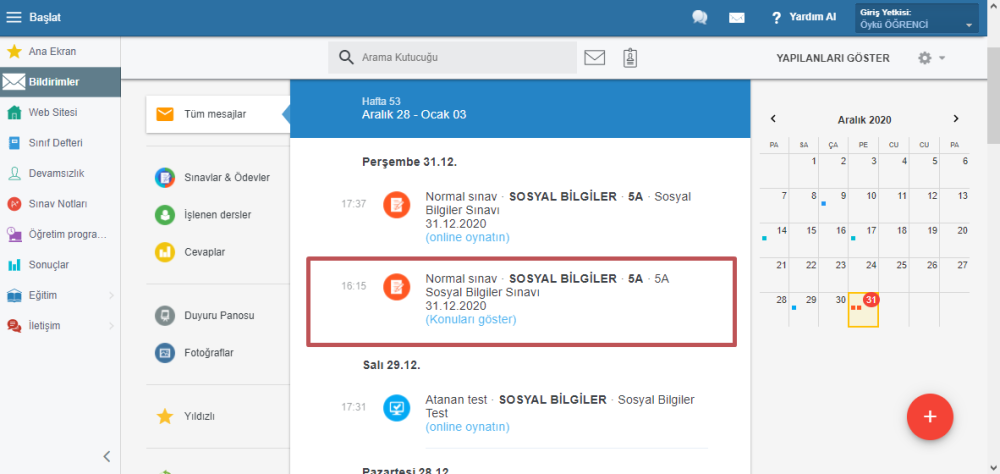 Öğrencilere bildirim gider.