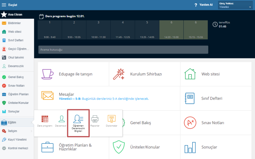 Sol menüden, Eğitim sekmesine tıkladığınızda Öğretmen Devamsızlık Bilgileri modülünü göreceksiniz.