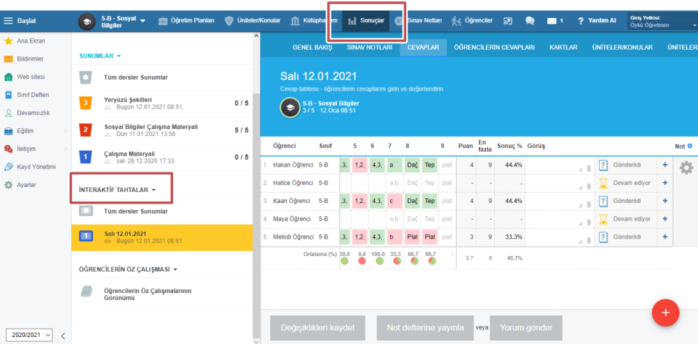 İnteraktif dersin sonunda öğretmen, öğrencilerin cevaplarına Sonuçlar/İnteraktif tahta sekmesinden erişebilir.