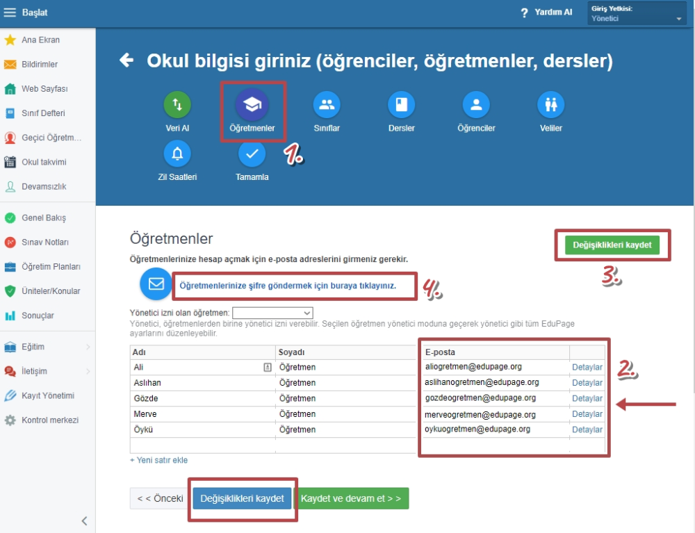 Bu değişiklikleri kaydettikten sonra öğretmenlerin hesaplarına kullanıcı adı ve şifreleri gönderebilirsiniz.