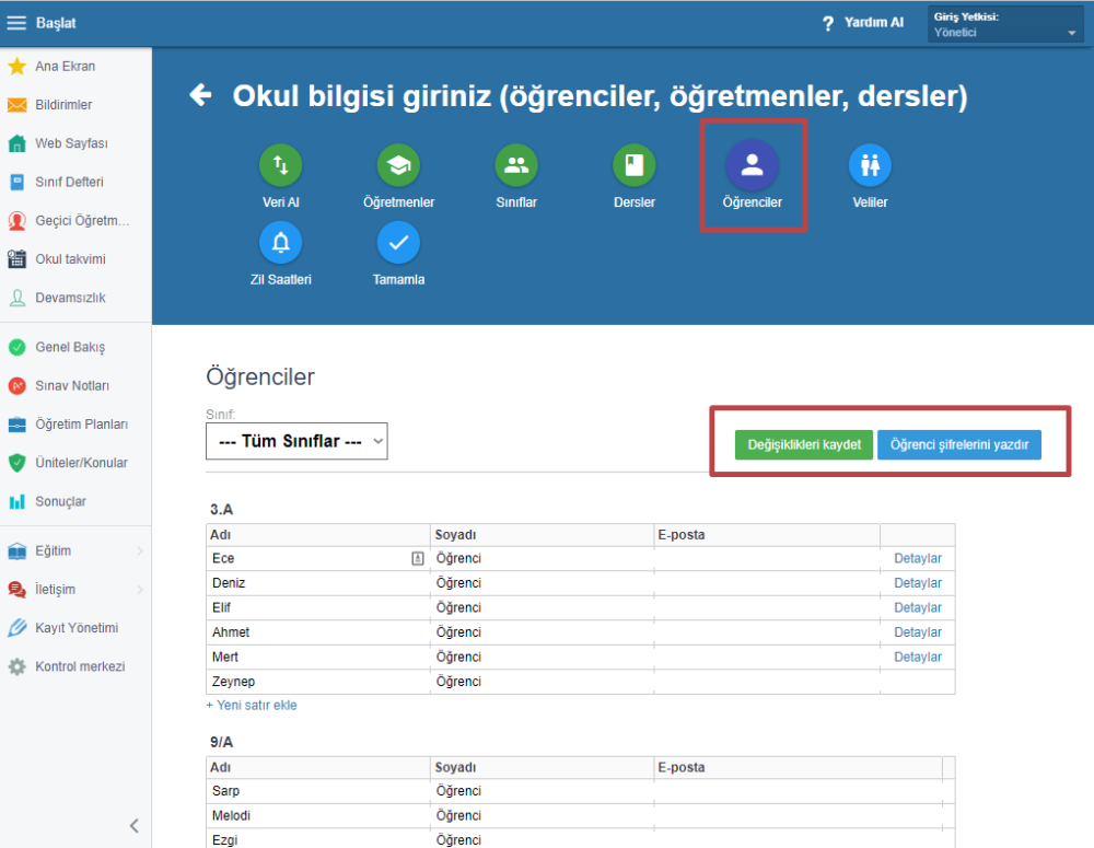 Öğrenciler sekmesinden öğrenci isimlerini girin. Kullanıcı adları ve şifreler direkt yazdırılabilir.