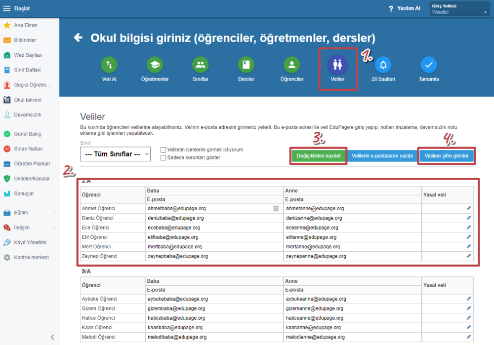 Veliler sekmesinden velilerin e-posta girişlerini yapın. Kullanıcı adı ve şifrelerini göndermeyi unutmayın.
