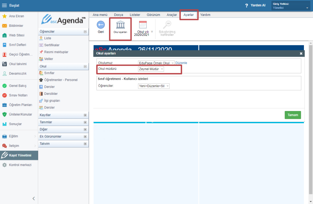 Yönetici, Kayıt Yönetimi sekmesinden Ayarlar > Okul ayarları’na giderek okul müdürü ekleyebilir.