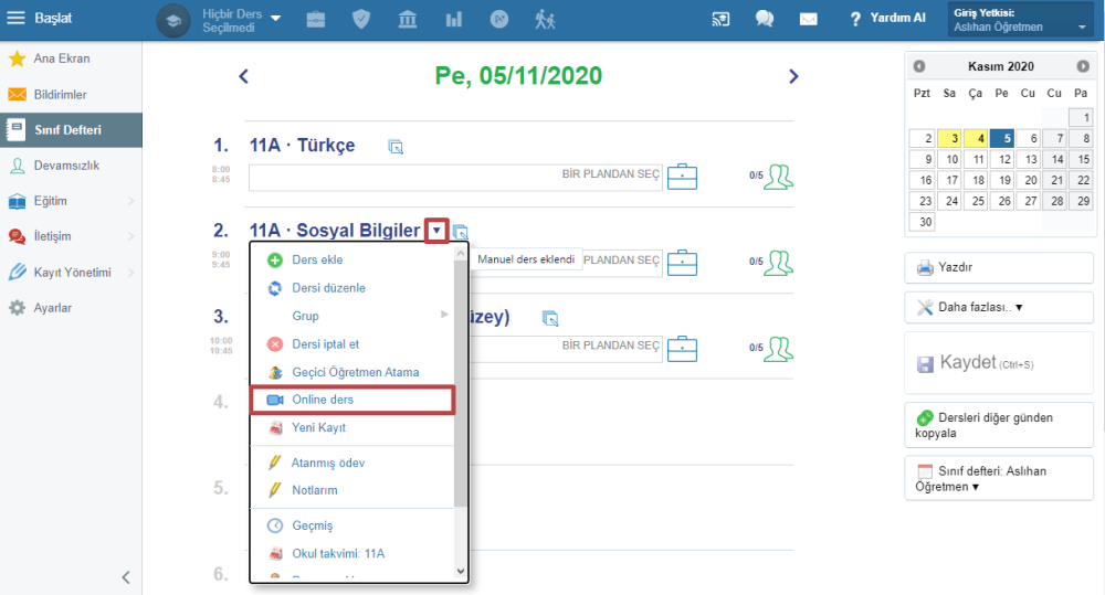 Sınıf defteri sekmesine gidin ve Zoom’da vermek istediğiniz derse tıklayın. Menüden online ders seçeneğini seçin.