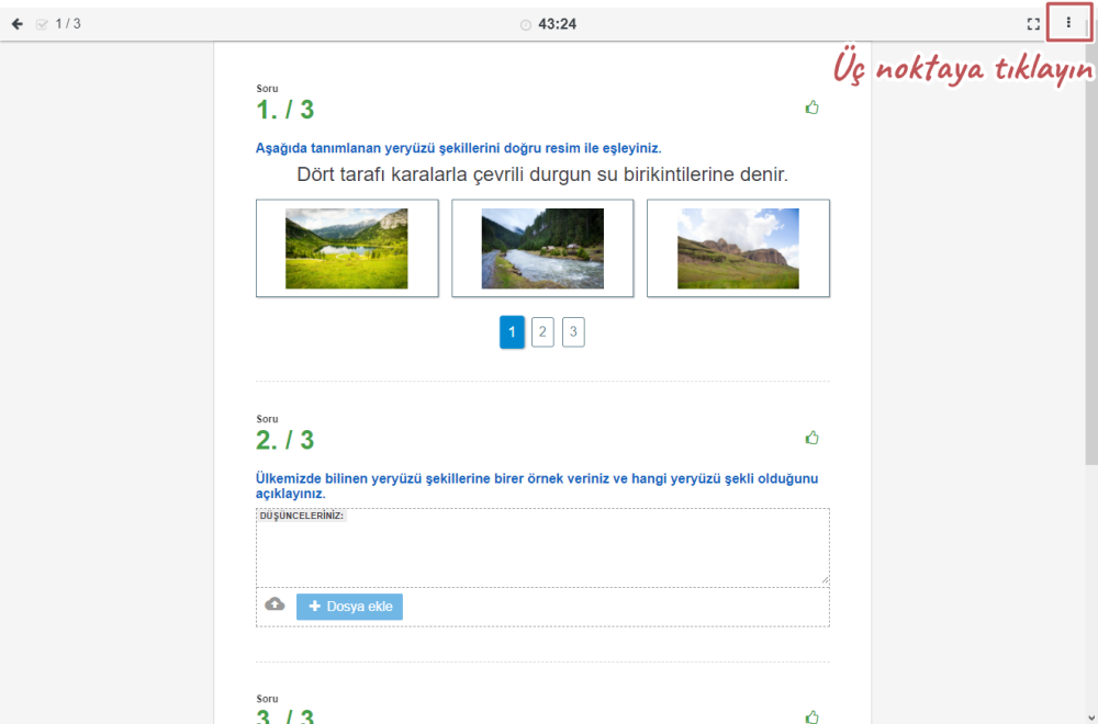 Öğrencinin tekrar kendi hesabından testi açması gerekir. Daha sonra, sağ üst köşedeki üç noktaya gelin,