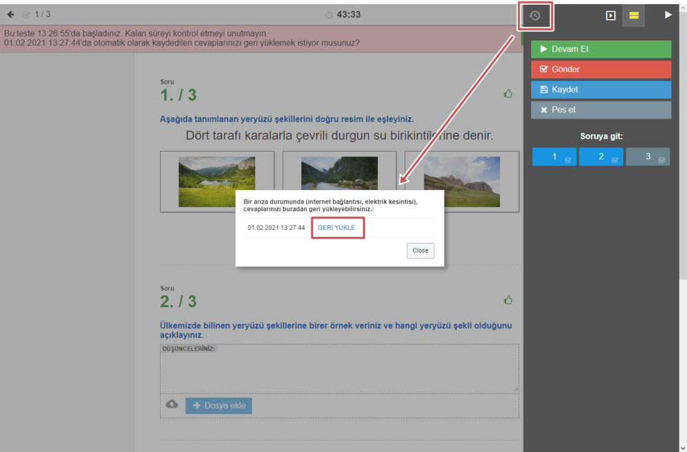 Test kesintiden önceki son ana döner. Eğer öğrenci testi tamamlamadıysa, sistem nerede kaldığını hatırlar. Böylelikle öğrenci testi tamamlayabilir.