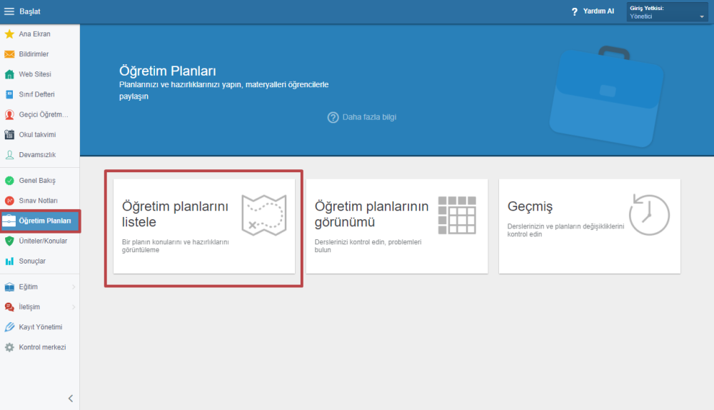 Sol menüden Öğretim Planları sekmesini seçin ve Öğretim planlarını listele’ye tıklayın.