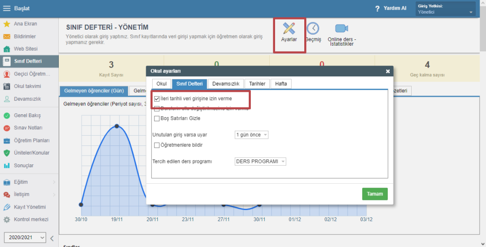 Yönetici, sınıf defterine müfredatın önceden girilmesini engelleyebilir. Bu ayara sol menüdeki “Sınıf Defteri” sekmesinden “Ayarlar” sekmesine tıklayarak ulaşabilirsiniz.