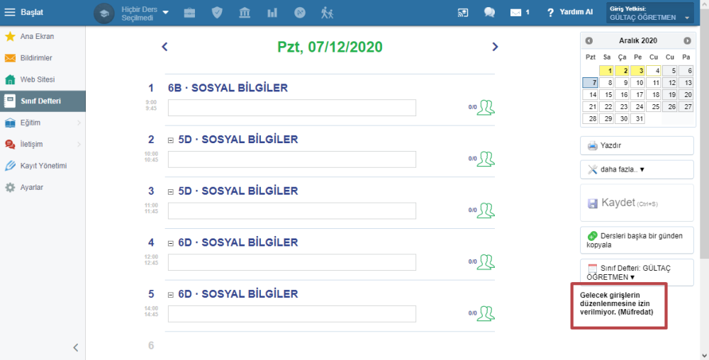 Öğretmen sınıf defterinde ileri tarihli bir giriş yapmak istediğinde, sağ alt köşede bir uyarı görür.