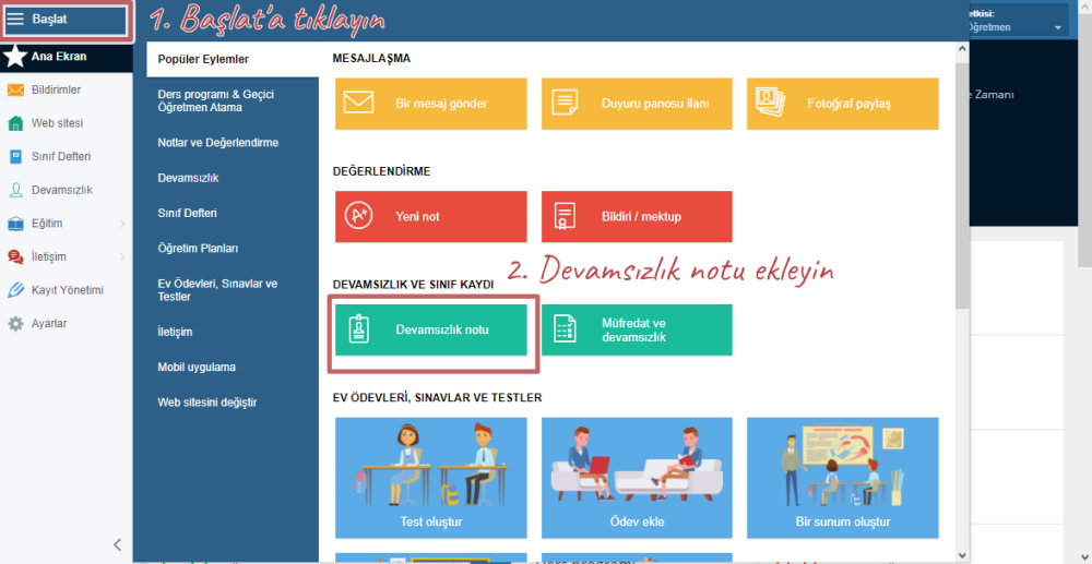 Sol menüden Başlat’a tıklayın ve Devamsızlık notu seçeneğine tıklayın.